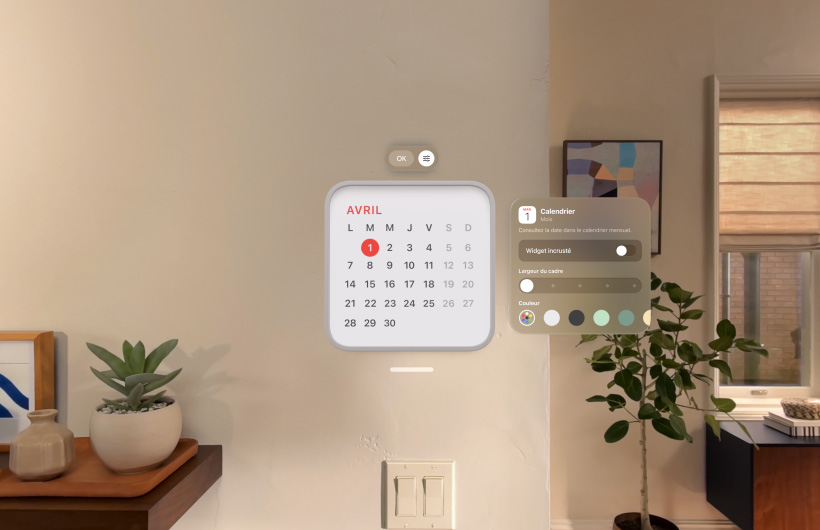 Avec les widgets, vous pouvez organiser vos apps et informations préférées – comme Photos, Horloge, Musique et Calendrier – dans votre espace, exactement comme vous le souhaitez. Personnalisez l’épaisseur, la couleur et la profondeur de leur cadre, et retrouvez-les exactement là où vous les avez laissées, à chaque fois que vous utilisez l’Apple Vision Pro.