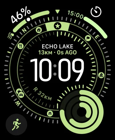 Apple Watch Ultra 3,採用原色鈦金屬錶殼,配以霓虹綠色海洋錶帶,螢幕顯示定向運動錶面的指南針