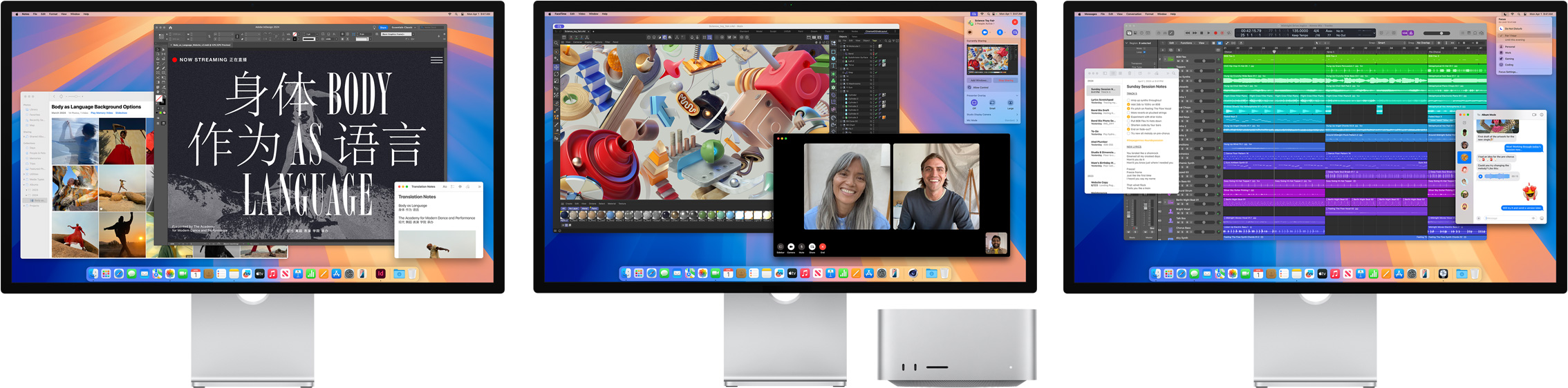 Our hardware and software are designed together. That integration is what enables amazing features like Center Stage, Spatial Audio, and “Hey Siri.” For pro workflows, macOS supports reference modes and fine-tune calibration so you can match industry standards — whether it’s HD and SD video or broader uses such as photography, web development, design, and print.